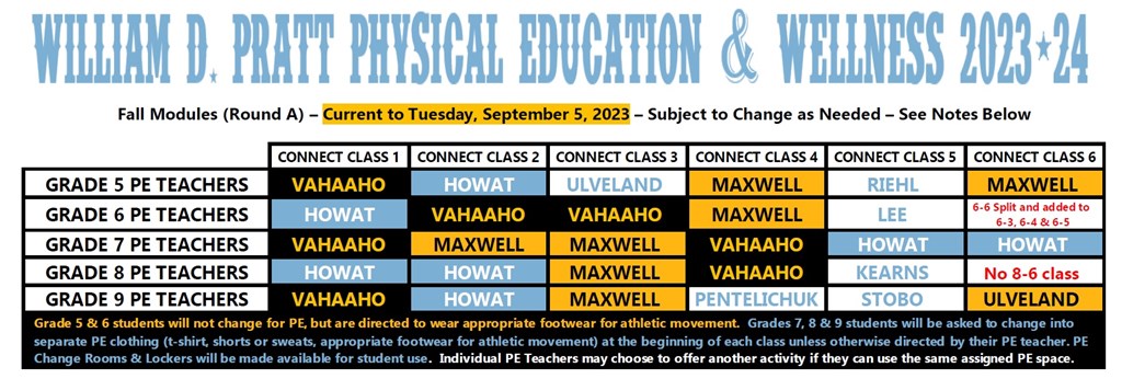 All William D. Pratt students in grades 7, 8 & 9 are required to change for their Physical Education classes unless otherwise directed. Specifically, each student is required to meet the following 3 standards to be considered changed for P.E. class: